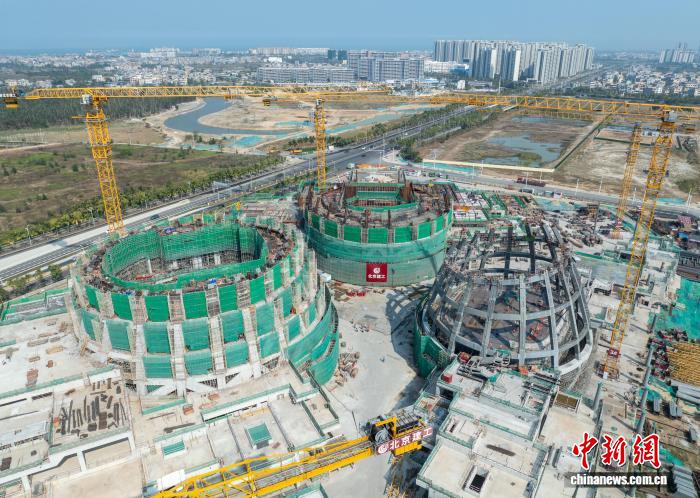 1月17日,位于海口江东新区的海南省艺术中心项目正在建设中。(无人机照片) 记者 骆云飞 摄