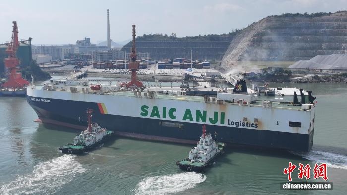 27日上午,装载着上汽宁德基地生产的991辆名爵汽车的大型滚装船“上汽安吉凤凰”轮,在位于福建省宁德市的宁德口岸漳湾宁连码头7号泊位出港,将航行至连云港,继续装车后驶往沙特阿拉伯。