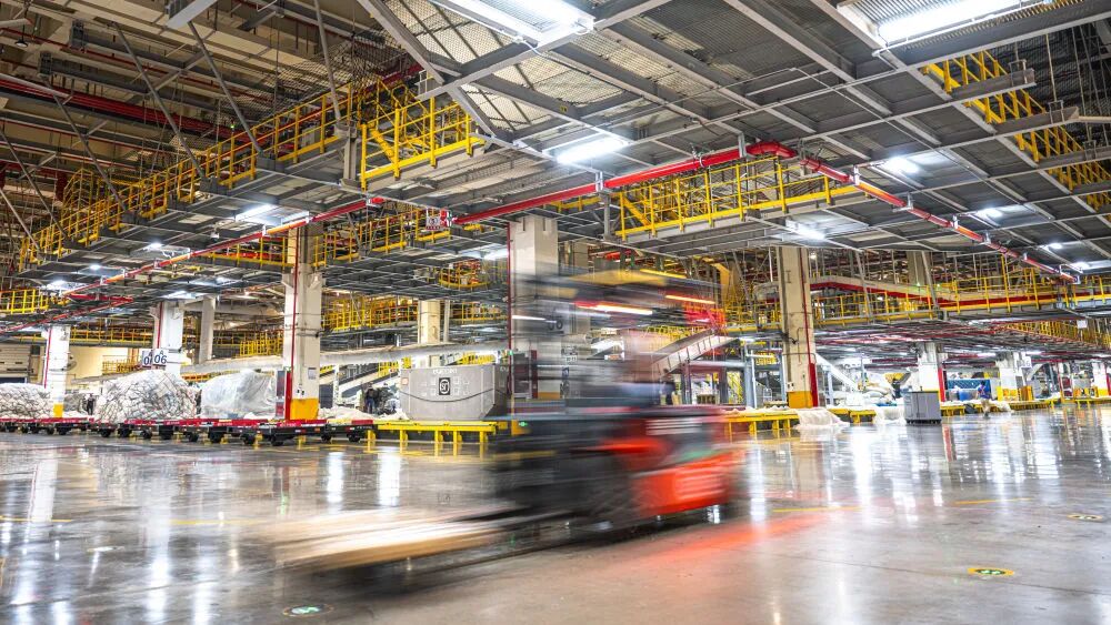 凌晨,货物被转运至鄂州花湖国际机场转运中心进行分拣作业。新华社记者肖艺九 摄