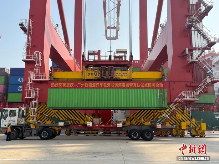 装载着108辆“重庆造”新能源汽车的36个集装箱19日在广州港南沙港区完成吊装启运,标志着“重庆-广州新能源汽车铁海联运海事监管互认试点服务”顺利实施,一条连接西南与华南的新能源汽车出海绿色新通道成功贯通。