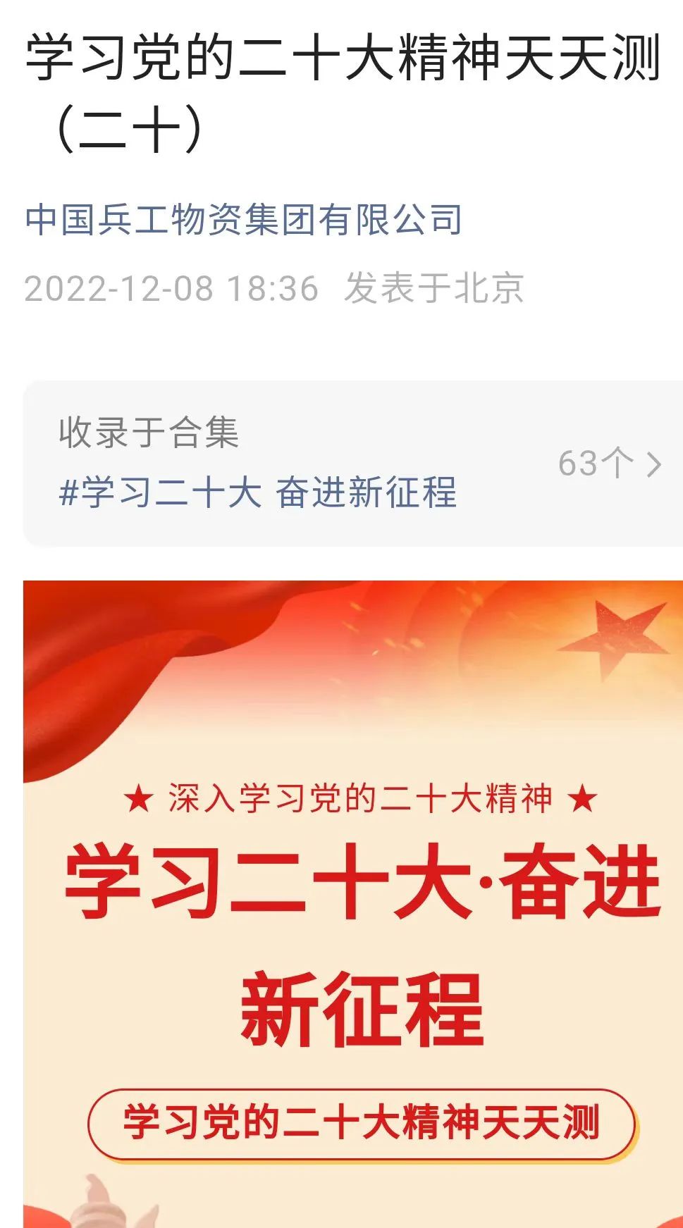 党的二十大胜利召开以来,兵工物资集团党委始终将学习宣传贯彻党的二十大精神作为当前及今后一个时期的首要政治任务,深刻领会精神实质,准确把握核心要义,通过建强队伍、广搭平台、理清思路等多项举措,广泛掀起学习宣传党的二十大精神热潮,推动党的二十大精神在公司落地生根、开花结果。