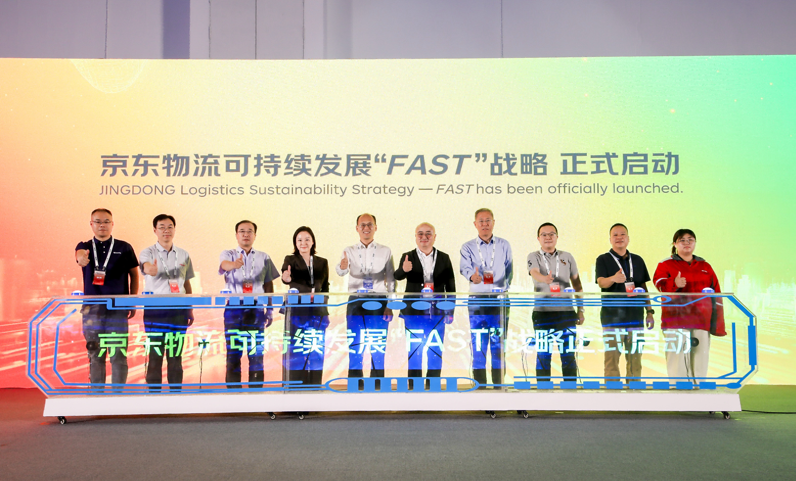 在中国国际可持续交通创新和知识中心副主任谢辉、全国工商联物流业委员会常务秘书长段志春、可持续发展经济导刊社长兼主编于志宏、中国循环经济协会会长助理潘永刚、中国企业改革与发展研究会研究员冯超、东方雨虹制造集团总裁吴士慧、李宁(中国)体育用品有限公司供应链采购负责人龙炜、长城商用车产品gtm总经理卢文、京东物流北京冷链库工单处理员张冬雪的共同见证下,京东物流发展“fast”战略正式启动。
