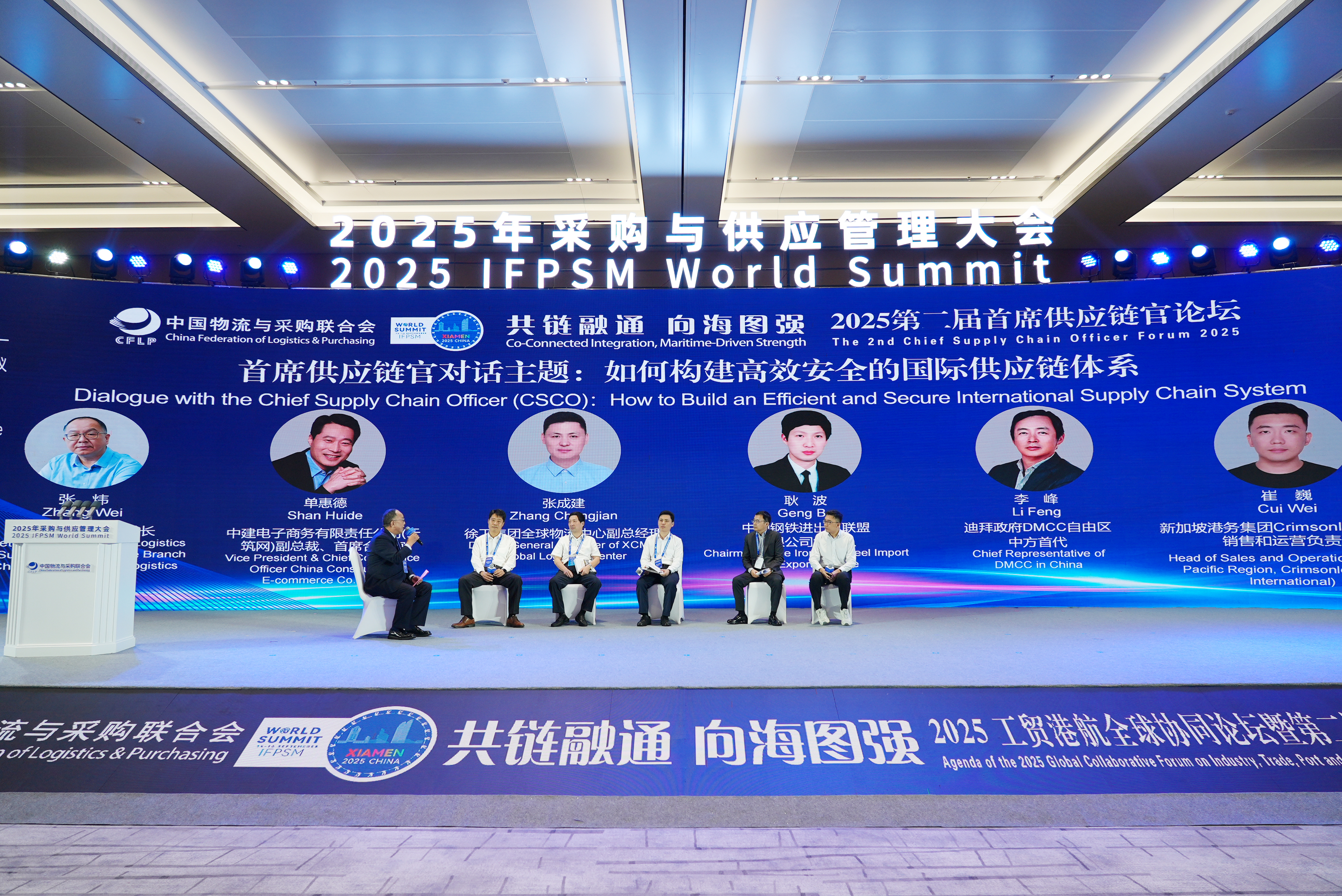 论坛“对话首席供应链官”环节进行了主题为“如何构建高效安全的国际供应链体系”的高端对话,中国物流与采购联合会物流与供应链金融分会秘书长张炜主持对话。中建电子商务有限责任公司副总裁、首席合规官单惠德,徐工集团全球物流中心副总经理张成建,中国钢铁进出口产业联盟有限公司董事长耿波,阿拉伯联合酋长国迪拜政府dmcc自由区中方首席代表李峰,新加坡港务集团上海劲升软件科技有限公司大中华区总监崔巍参加了对话。