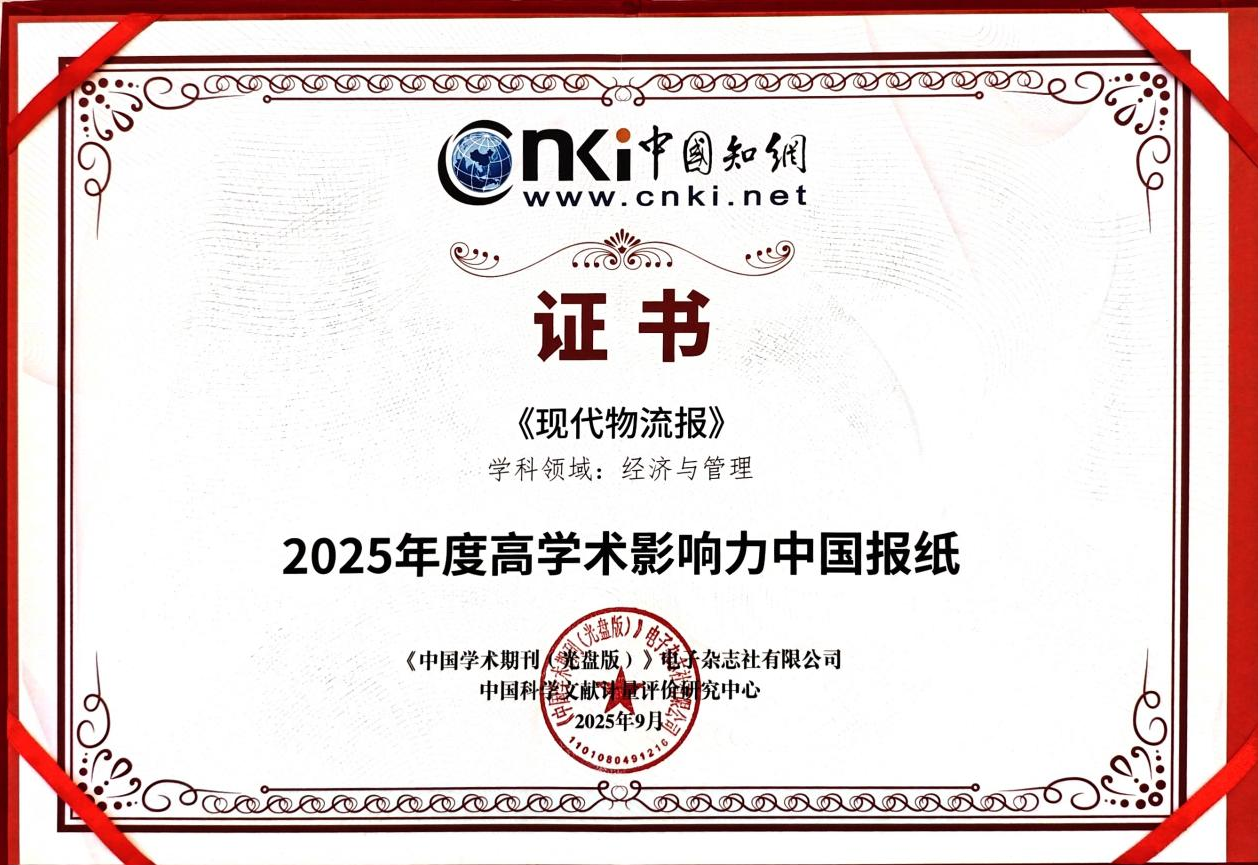 《现代物流报》荣获“2025年度高学术影响力中国报纸”称号-ag平台入口
