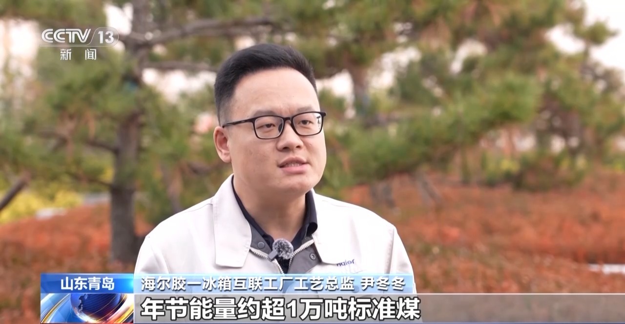 海尔胶一冰箱互联工厂工艺总监 尹冬冬:今年我们园区的光伏供电提升到35%。今年我们工厂预计生产200多万台冰箱,年节能量约超1万吨标准煤,减少二氧化碳排放2.6万余吨。