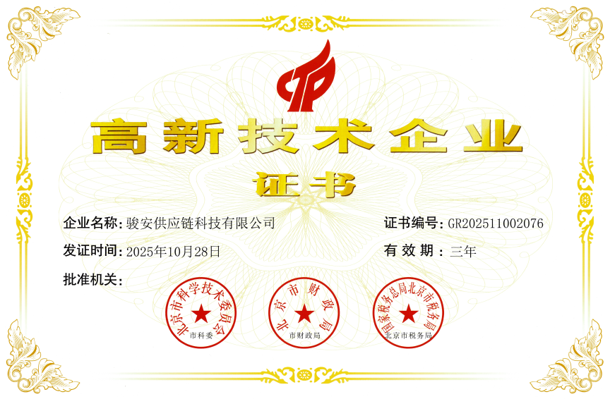 近日,兵工物资集团所属骏安供应链科技有限公司成功通过高新技术企业认定,并于12月17日正式获授门头沟区科学技术委员会颁发的《高新技术企业证书》。