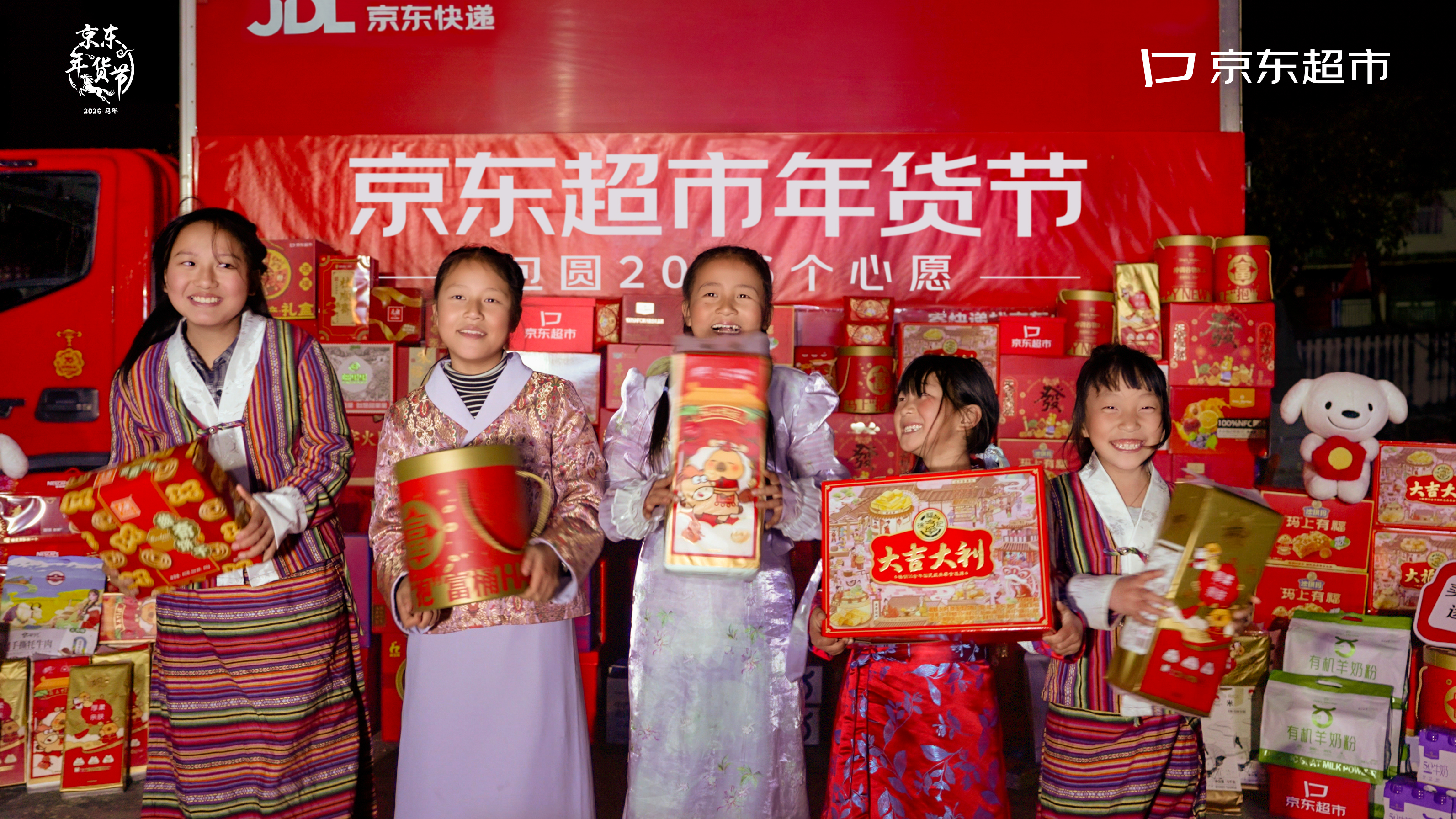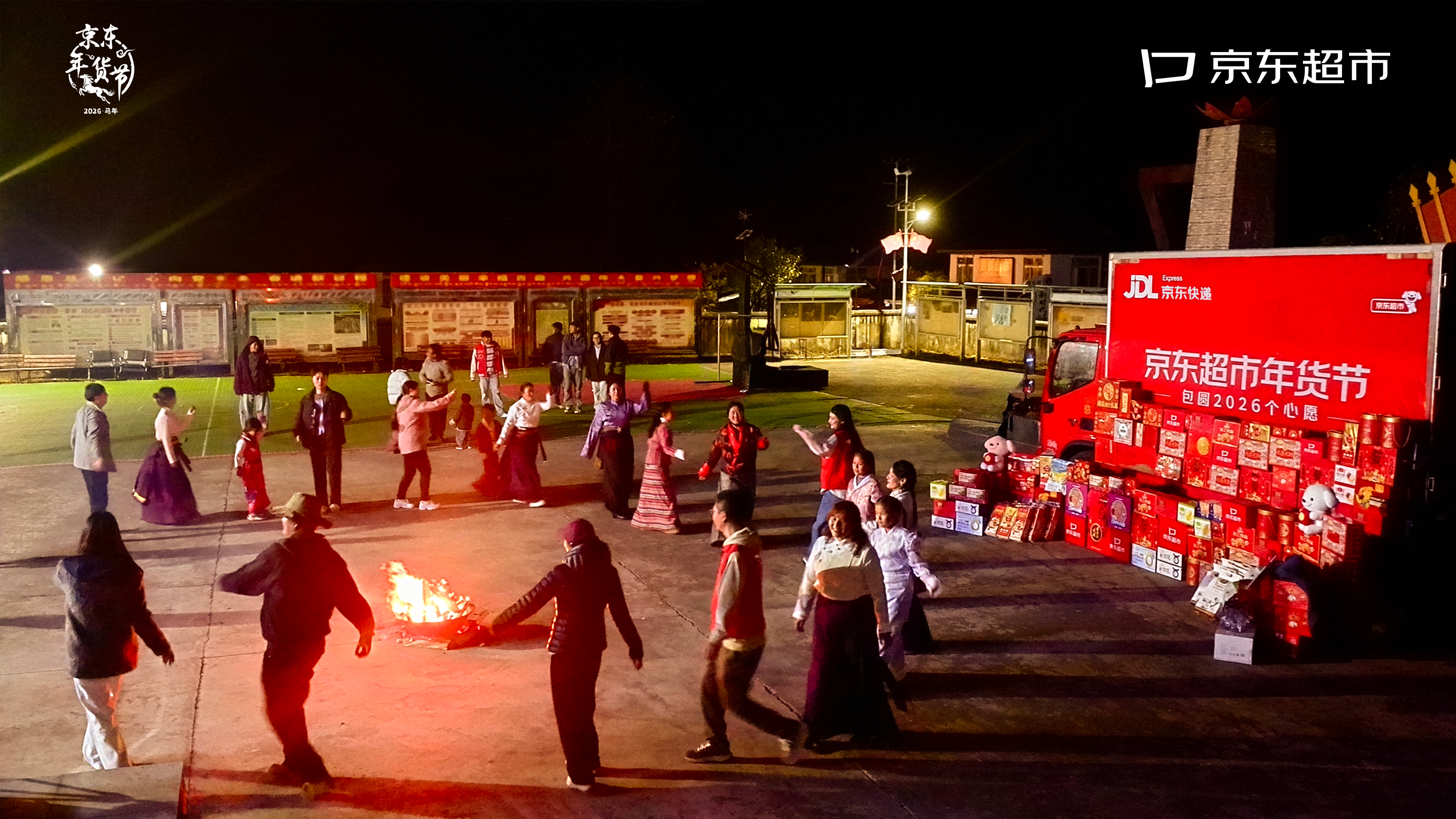 除了帮助实现团圆,当晚,京东超市还准备了一车丰富有特色的年货,比如,全国特色礼盒、零食、罐头、饮料等,把温暖和年味送到贡日村,让村民感受新年的喜悦。