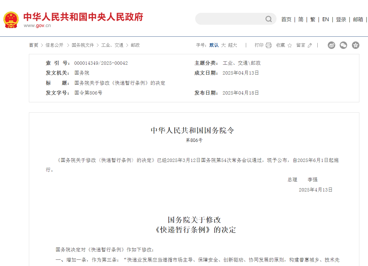 导读:国务院总理李强日前签署国务院令,公布《国务院关于修改〈快递暂行条例〉的决定》(以下简称《决定》)。《决定》自2025年6月1日起施行,共15条,主要规定了以下内容。