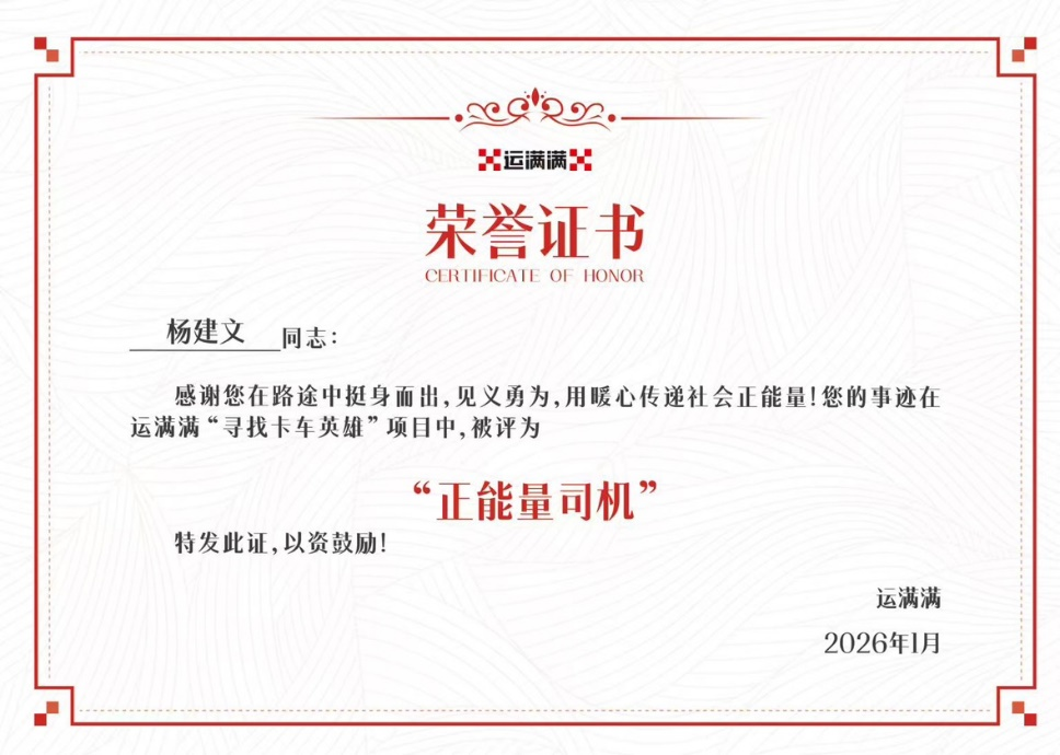 1月19日,运满满正式授予杨建文“卡车英雄·正能量司机”称号,颁发ag平台入口的荣誉证书、感谢信和奖金,致敬其以干线侠义,锻造公路脊梁。