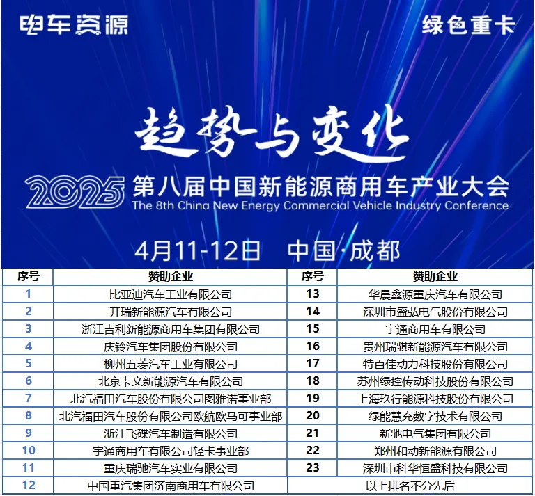 本次大会的成功开幕,为新能源商用车产业搭建了交流合作的优质平台,在政策解读、技术创新、市场拓展、商业模式探索等方面展开深入探讨,凝聚行业共识。离不开产业链上下游各界的积极参与,更离不开赞助企业的鼎力支持。在此,对赞助企业诚挚感谢。