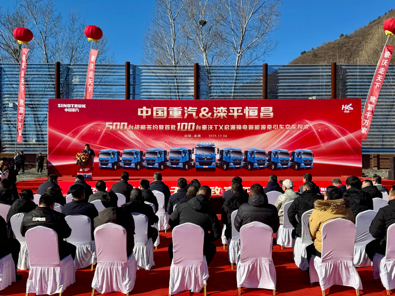 12月4日,中国重汽集团与滦平恒昌货物运输有限公司在河北承德成功举办500台战略签约暨首批100台豪沃tx换电新能源牵引车交车仪式,此次活动不仅完成了首批100台豪沃tx换电新能源牵引车的交付,更标志着双方在新能源物流领域建立了长期战略合作关系。