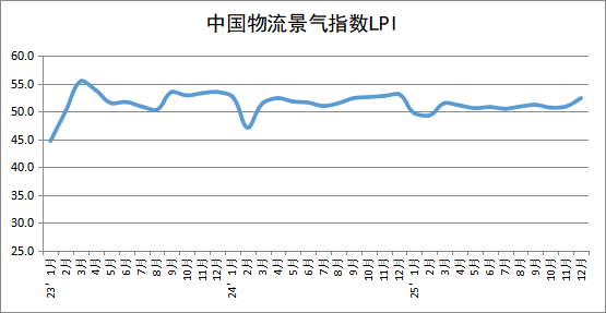 中国物流与采购联合会发布的2025年12月份中国物流业景气指数为52.4%,较上月回升1.5个百分点。