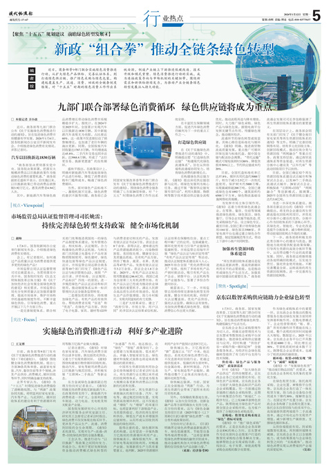 近日,商务部等9部门联合实施绿色消费推进行动,从扩大绿色产品供给、完善认证体系,到打造绿色供应链、推广绿色采购与绿色包装,构建起覆盖生产、流通、消费、回收的全链条制度框架,对“十五五”时期的绿色消费工作作出系统安排,倒逼产业链上下游推进低碳改造、技术升级和模式重塑。绿色消费推进行动的实施,成为连接政策导向与市场机制的关键纽带,围绕新需求和新供给持续发力,为推动产业全链条绿色转型发展注入持久动能。