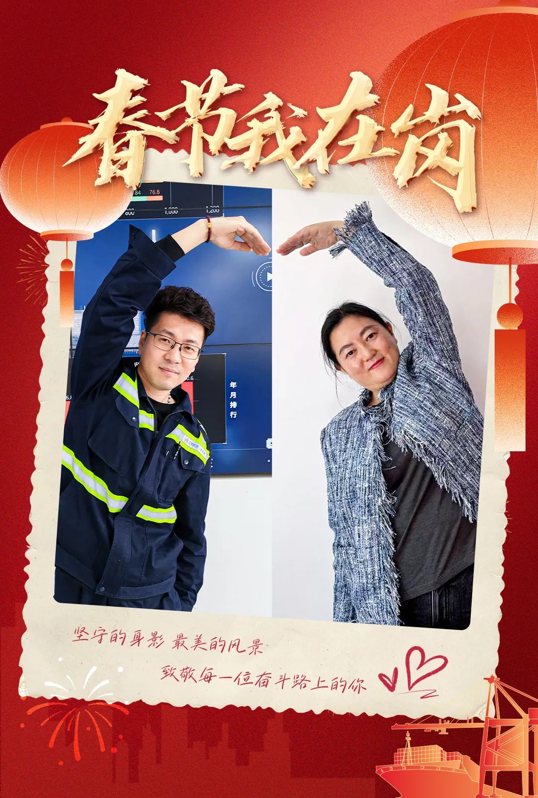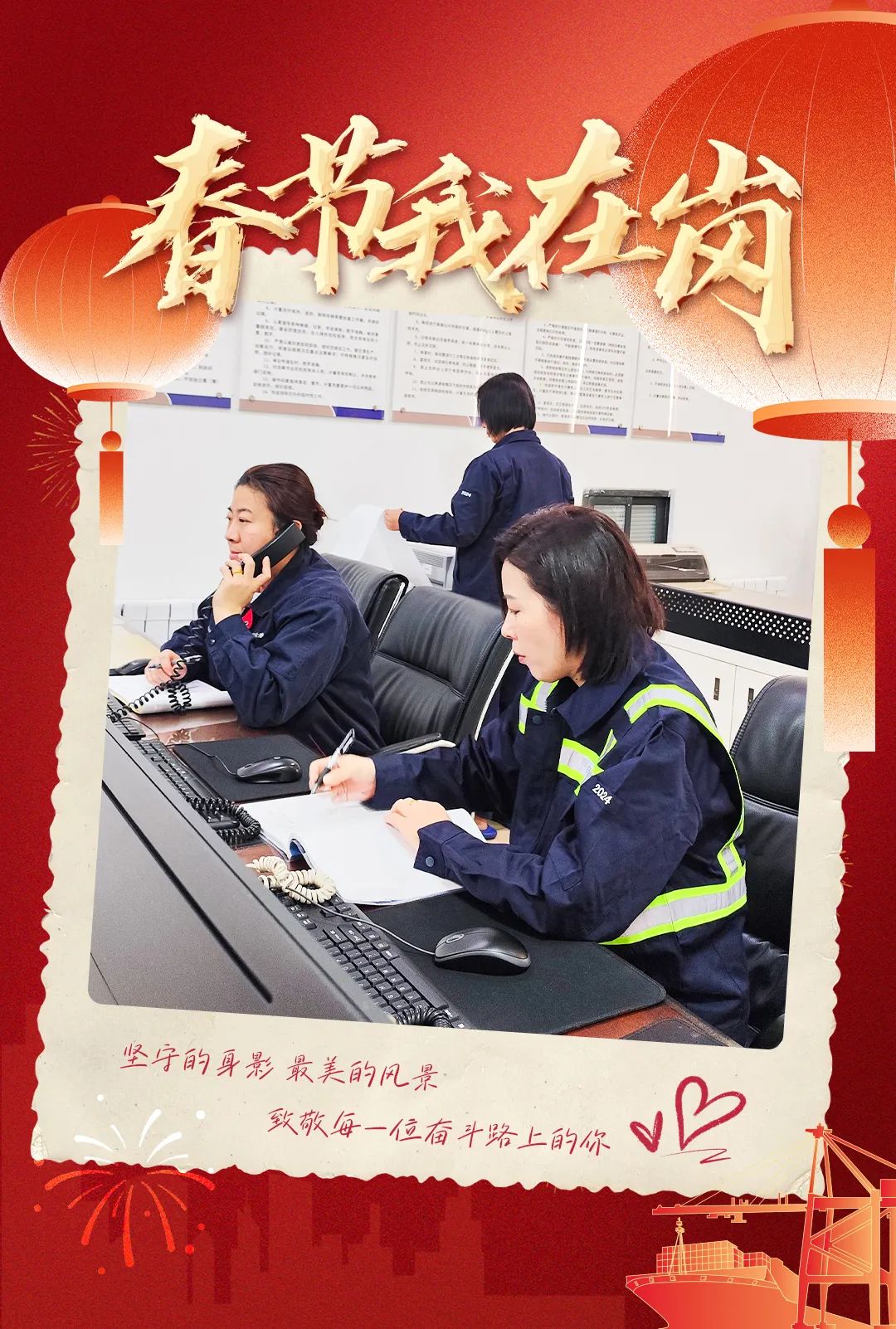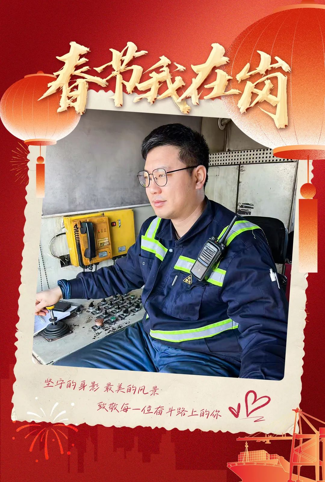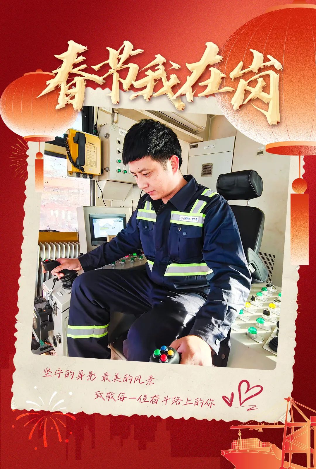 当璀璨烟花在夜幕中绽放,将城市的天空点缀得五彩斑斓,港口灯火如昼,机械轰鸣声连绵不绝。绥中港一线人员紧盯安全生产,精准操作机械,货物装卸有条不紊。他们虽然缺席家中团圆宴,但也有幸与队友并肩作战,默契配合,让港口高效运转,保障物资安全装卸。寒夜中,他们彼此加油打气,这份一起奋斗的情谊与责任担当,温暖心间。他们用坚守,为港口贺岁,用奋斗,为岗位添彩。