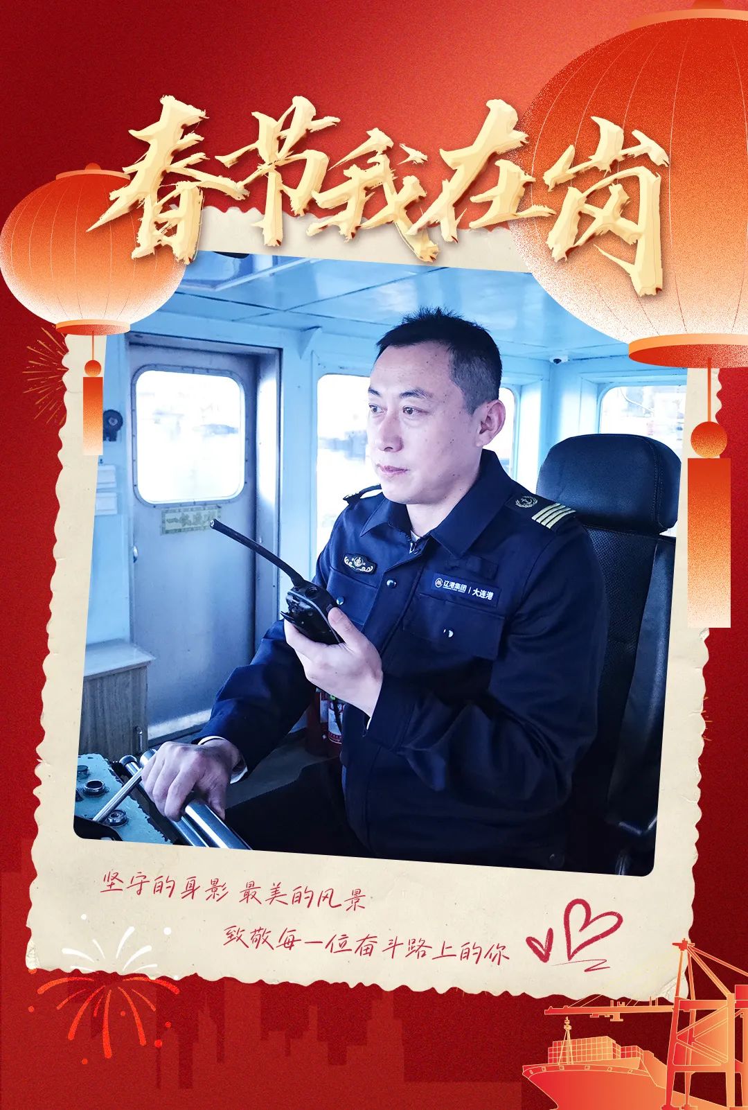 当新春的第一缕阳光照向大连港集装箱码头,波光粼粼的海面映衬着繁忙的景象。在晨曦微光中,船舶调度员刘洋已开始了新一天的工作。办公桌上,已铺满写着密密麻麻船舶调度计划的统计表,耳畔是电话铃声的连续“交响”。尽管不能与家人围坐餐桌,共享新春第一天的朝阳与美食,但一个与家人温馨团聚的画面不禁油然而生,刘洋想象着与家人进行一场超越距离的“合影”,穿透时空界限,让心与心紧紧相连。这份特殊的“比心”,成为了他们春节隔空团聚的独特仪式。尽管不能团聚,但家人的爱与温暖从未缺席。
