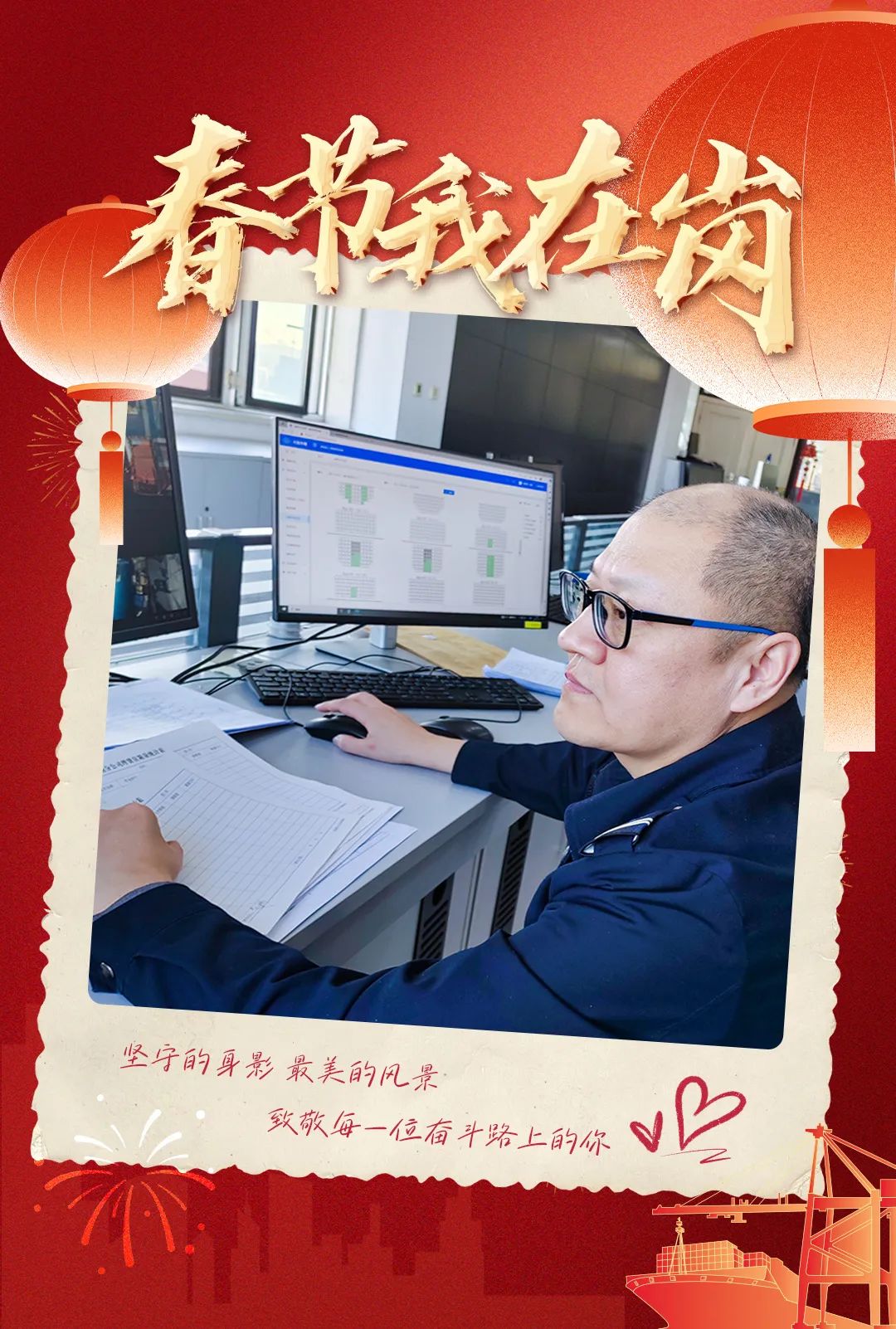 港外过节,港内大干!作为一名老外理人,理货员董黎杰已经记不清这是第几个没有和家人在一起的团圆年了。虽心怀愧疚,但身为一名党员,能与同事们一起坚守岗位,高效作业,确保每一票货物准确无误,家人的理解与支持让他倍感温暖。在春节这个特殊的日子里,他和同事们放弃与家人团聚,选择默默奉献,用坚守书写着理货人的荣光。