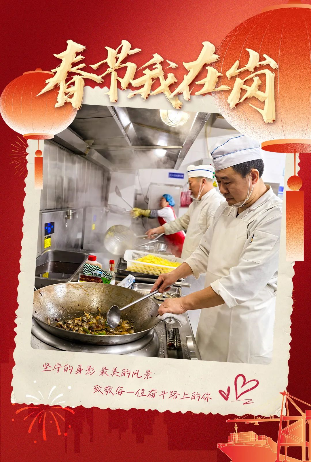 民以食为天,食以安为先。为了让港口员工在春节期间吃上和家里一样可口的饭菜,厨师孙威和同事们每天天不亮就开始准备食材,精心制定菜谱,力求每一餐都能给员工带来惊喜和满足,感受家的味道。临近中午,厨房内热气腾腾,孙威挥动大勺,制作着每一道精心准备的菜肴。这个春节,他们用自己的方式,为员工们送上特别的礼物——一份家的味道,一份深深的关爱。