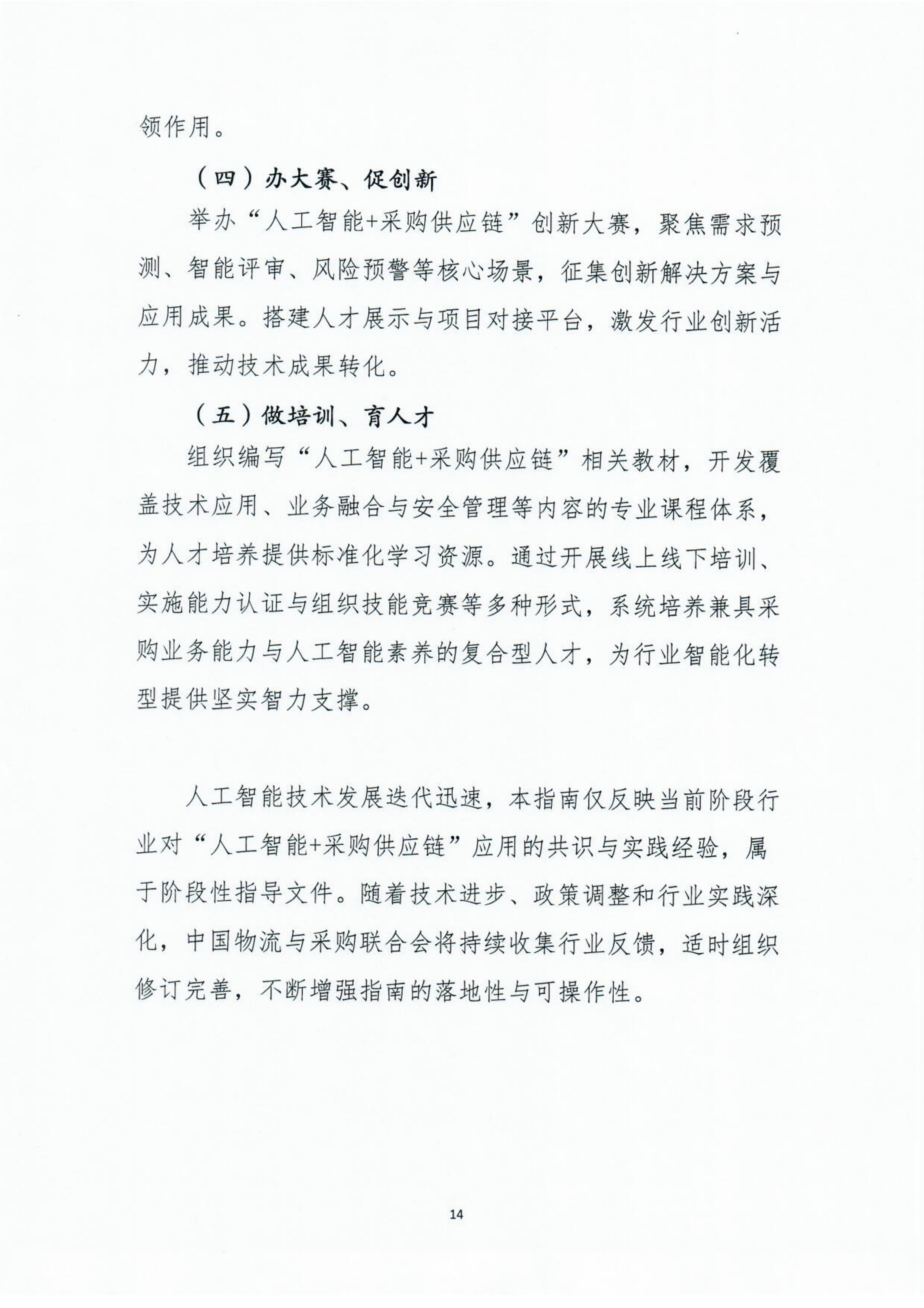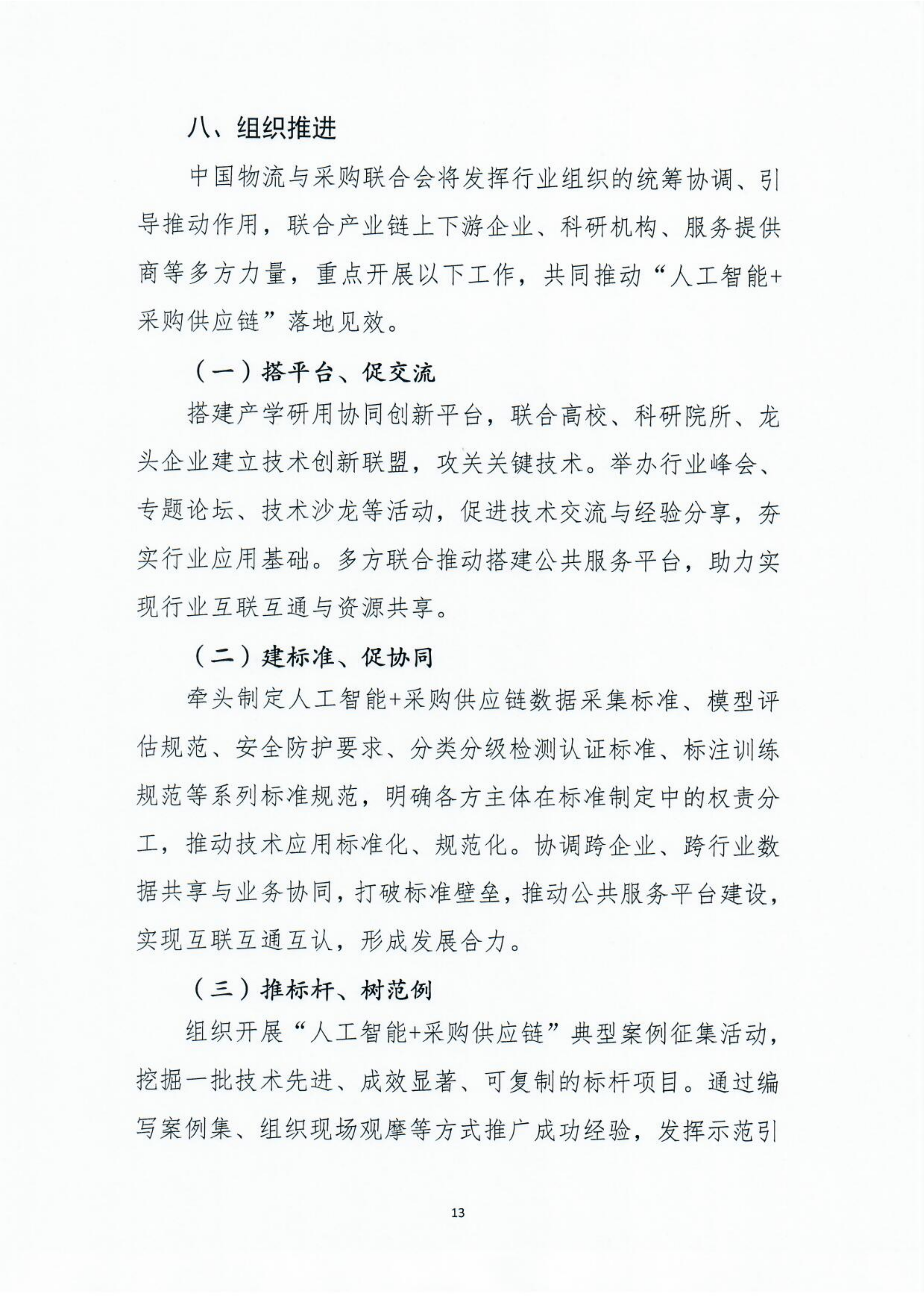 作为供应链领域的行业组织,中物联将致力于互联互通与公共服务,联合多方力量,研究制定相关行业标准规范,诚挚期望广大企业、科研机构、技术伙伴与媒体界共同关注并参与“人工智能 采购供应链”的实践探索与生态共建。欢迎各方结合实际应用本指南,并反馈宝贵意见,携手推进采购供应链数智化进程,共筑安全、韧性、高效、绿色的现代采购供应链新生态。